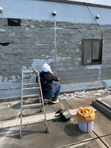 こんにちは。なないろ株式会社の岸田です。こう猛暑が続くとやはり思い出すのはあのアイテム。…冷暖房服買っておけば良かったなと…そんなお買い物下手な本日は4F建ての屋上の外壁塗装。10年以上塗り替えてなく